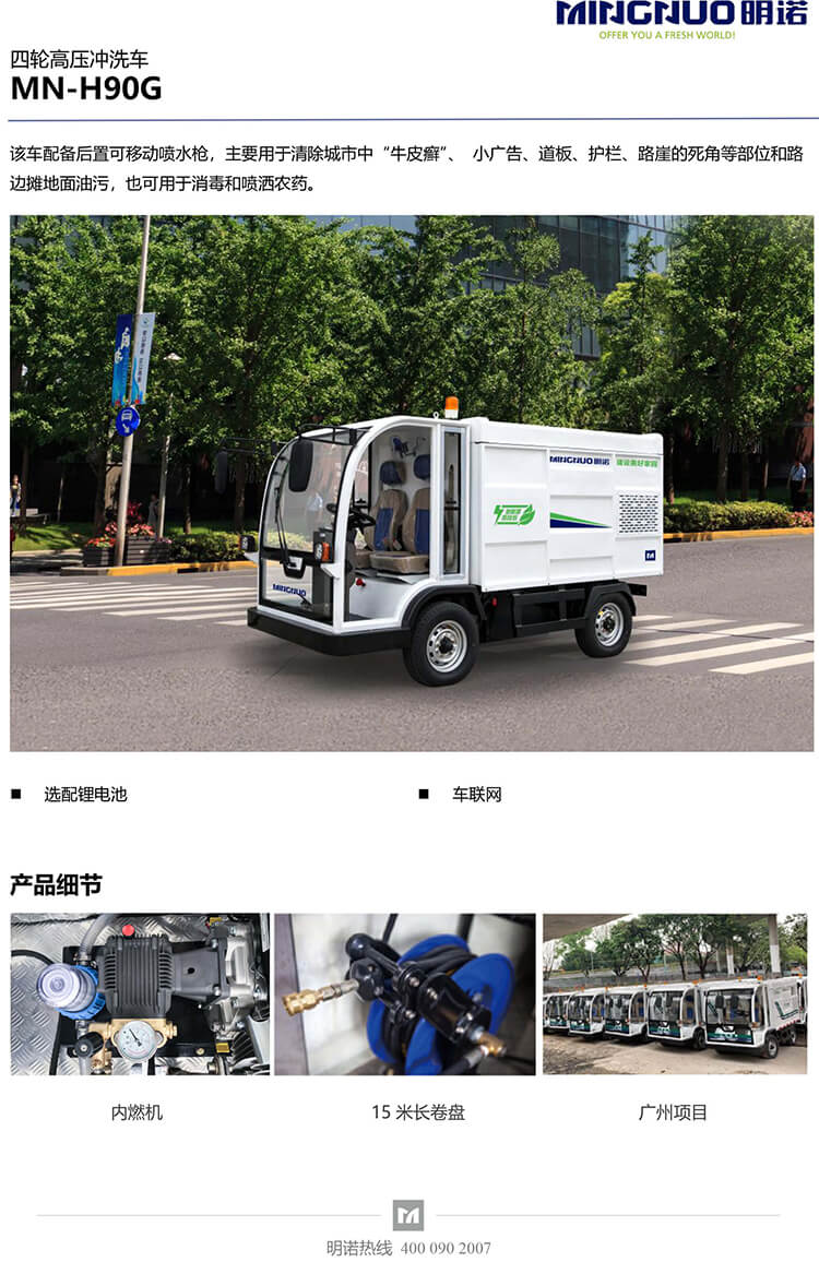 l 15米長卷盤管配有高壓水槍,操作方便簡易且省時省力,作業范圍大,輕松清理集中污漬和街邊小廣告。