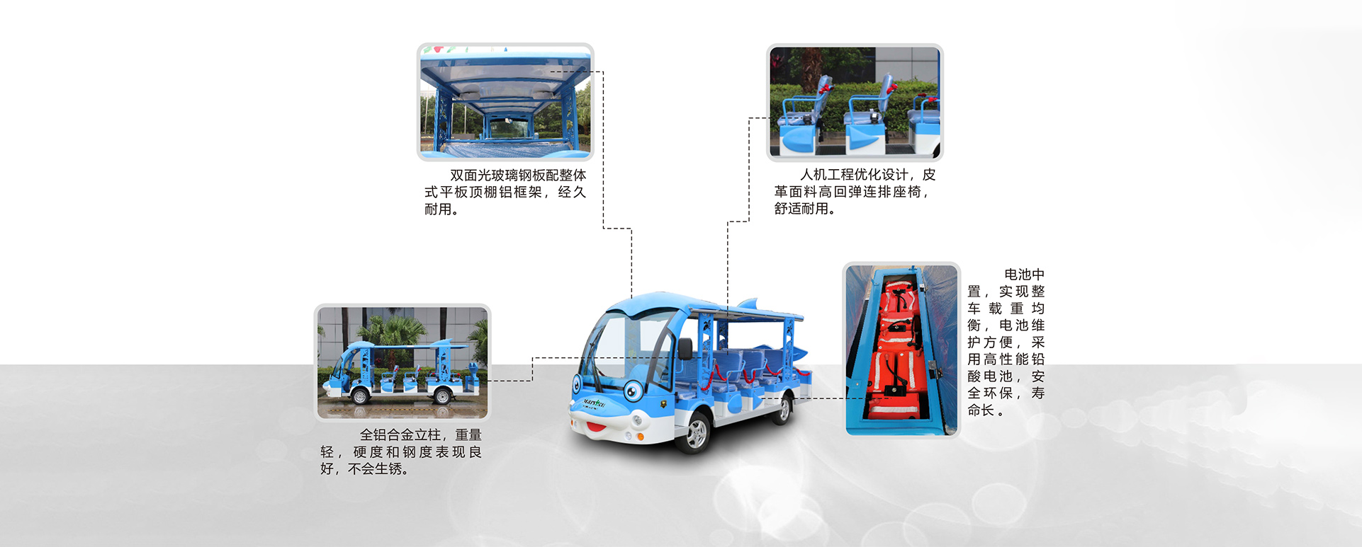 車頭:車頭借鑒海豚造型,使用高密度玻璃鋼材質,堅固耐用,表面做烤漆處理,精致美觀。